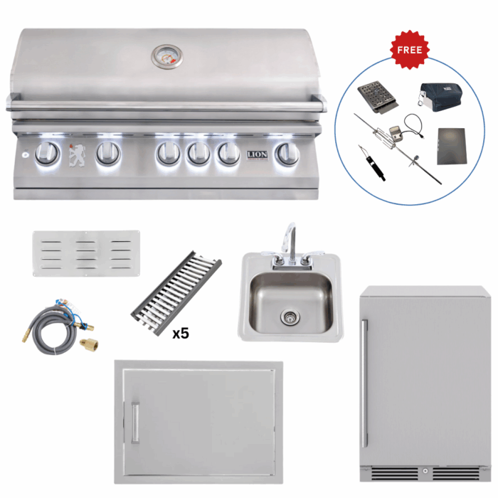Lion Outdoor Kitchen Lux Package – L90000 Grill, Bar Sink, Beverage Cooler, Access Door & Flame Tray Upgrade w/ (FREE Gourmet Package)