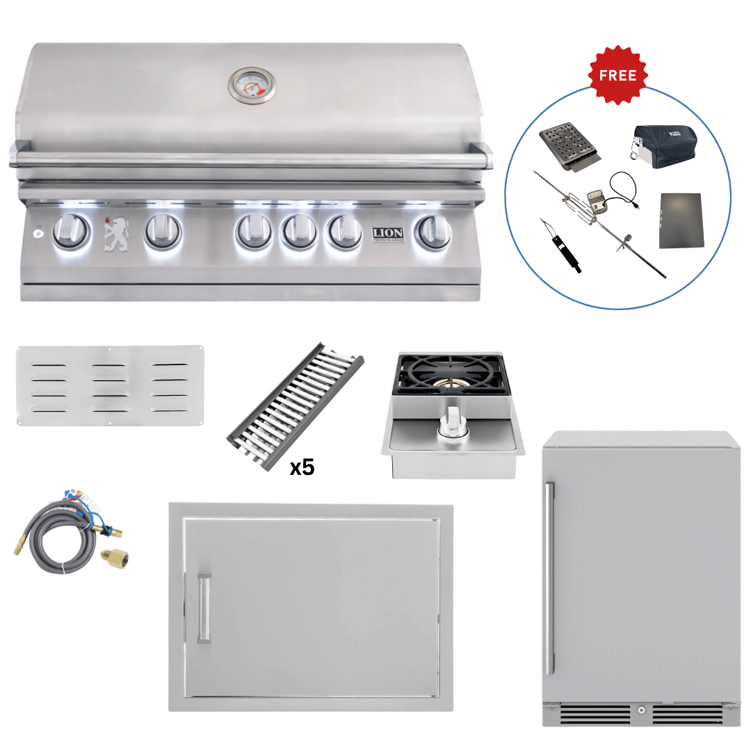 Lion Outdoor Kitchen Lux Package – L90000 Grill, Side Burner, Beverage Cooler, Access Door & Flame Tray Upgrade w/ (FREE Gourmet Package)