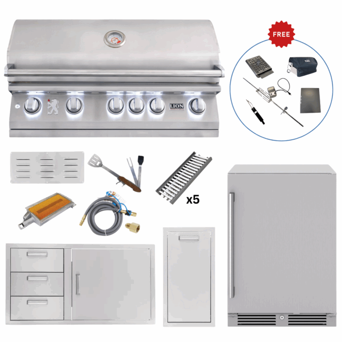 Lion Outdoor Kitchen Lux Package: L90000 40” Grill, 40” Double Door, 24” Outdoor Beverage Cooler, Drop-In Sink, 21” Vertical Access Door & Island Bundle Accessories! (FREE Gourmet Package)