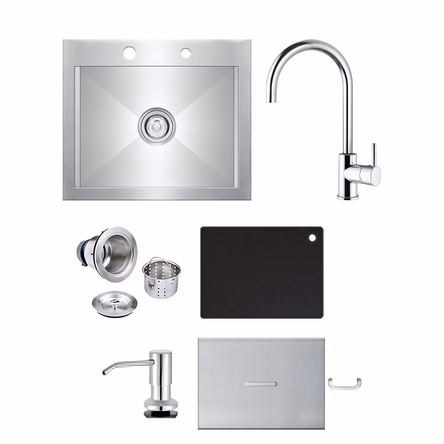This sink comes fully equipped to function as a complete workstation right out of the box. Included with your purchase: